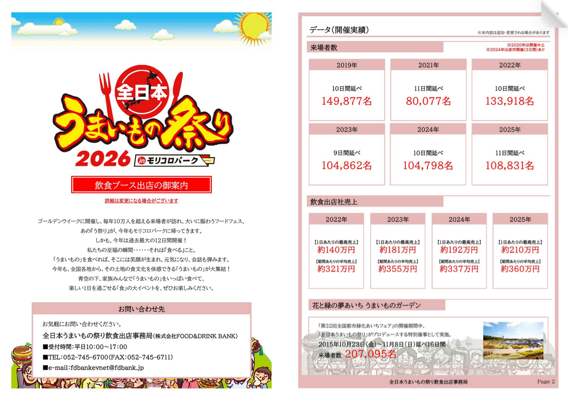 2026年GW、「全日本うまいもの祭り2026 in モリコロパーク」(通称「う祭り」)の開催を予定しています。つきましては、飲食ブース出店社の募集を開始します。毎回10万人を超えるお客様が来場し、都道府県を代表するグルメを大いに楽しむ、東海エリア定番となったゴールデンウイークのフードフェスです。ぜひ、この機会にご出店をご検討ください。